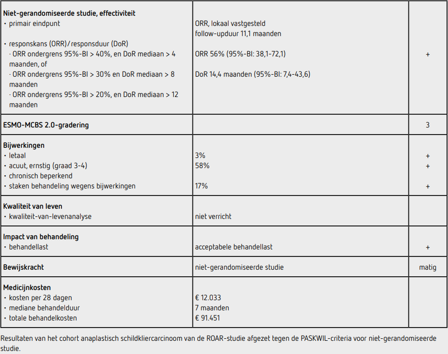 De bewijskracht van de studie is beperkt vanwege de nietgerandomiseerde opzet. De ROAR-studie is een basketstudie waarbij diverse tumortypen in verschillende cohorten werden geïncludeerd. Hierdoor kon met beperkte patiëntenaantallen per cohort een adequate power worden bereikt. De gezamenlijke analyse van het initiële cohort van 15 patiënten met anaplastisch schildkliercarcinoom in de ROAR-studie en de 21 patiënten van het expansiecohort leidt tot een robuustere schatting van het effect. De resultaten van deze cohorten komen goed overeen. Vanwege de afwezigheid van een referentiebehandeling voor anaplastisch schildkliercarcinoom ligt een eerstelijns setting voor de hand.